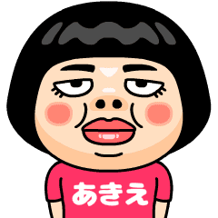 あきえ(アキエ)はとってもブスな女の子。自分の名前入りピンクTシャツを着るちょっと痛い子。自虐的だけどおはようからおやすみまで使える万能な名前スタンプです。