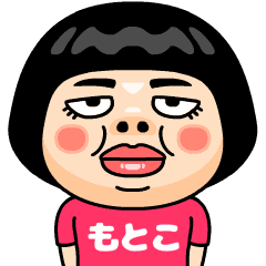 もとこ(モトコ)はとってもブスな女の子。自分の名前入りピンクTシャツを着るちょっと痛い子。自虐的だけどおはようからおやすみまで使える万能な名前スタンプです。