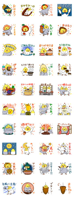 オカメインコの秋スタンプです。運動会、芸術の秋、食べ物など秋づくしです。藤栄田みお より発売