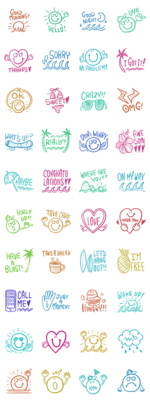 ラフでかわいい手描きのカラフルスタンプ☆簡単な英語で日常的にも使いやすい!サーフ、西海岸、夏を連想させるラフなタッチでサマーなトークを楽しんじゃおう☆YUURI KANNO より発売