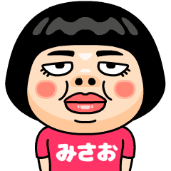 みさお(ミサオ)はとってもブスな女の子。自分の名前入りピンクTシャツを着るちょっと痛い子。自虐的だけどおはようからおやすみまで使える万能な名前スタンプです。