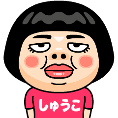 しゅうこ(シュウコ)はとってもブスな女の子。自分の名前入りピンクTシャツを着るちょっと痛い子。自虐的だけどおはようからおやすみまで使える万能な名前スタンプです。くーが より発売