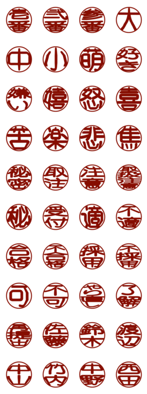 『喜怒哀楽』や『可決』等を印鑑風のスタンプにしていました。 日本人の代表的な姓もスタンプにしています。nishida1h より発売