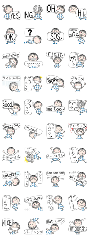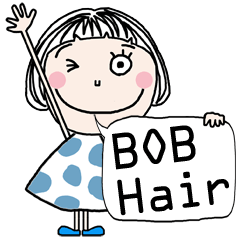 日常で毎日使いやすい言葉を日本語・カタカナ・英語を混ぜてクスッと笑えるおかっぱ☆ボブヘアの女の子スタンプです♡