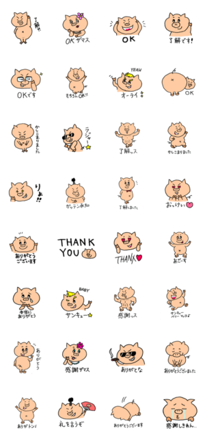 よく使うスタンプ「了解・OK」「ありがとう」の2種類に特化して作りました。オモシロ系〜丁寧まで、色んな場面対応します。ぶーちゃんスタンプ、お役に立てたら幸いです。