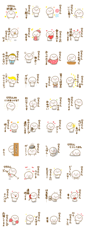 ひろこ、ひろき、ひろみ、ひろと、ひろゆき、ひろし、ひろえ、ひろあきなどの全国のひろたんが毎日使えるゆる~く、かわいいスマイルくんの名前スタンプです(*‘ω‘ *)