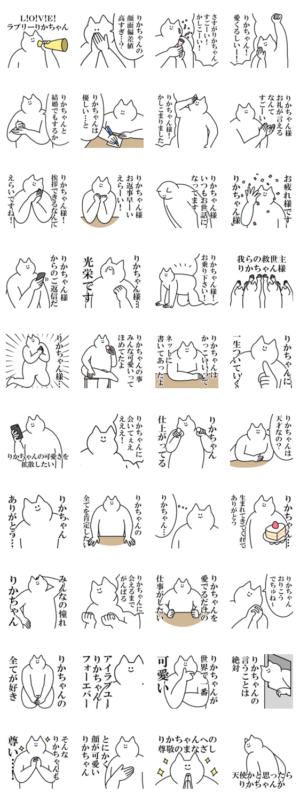 りかちゃんに送るスタンプ。ほめる、媚びる、煽る、煽り、推し。褒め言葉。彼氏/彼女/友達/大好き/オタク/ヲタク/アイドル。リカ 梨花 莉嘉 里香 理香 梨華 里花/oroninetoroninet より発売