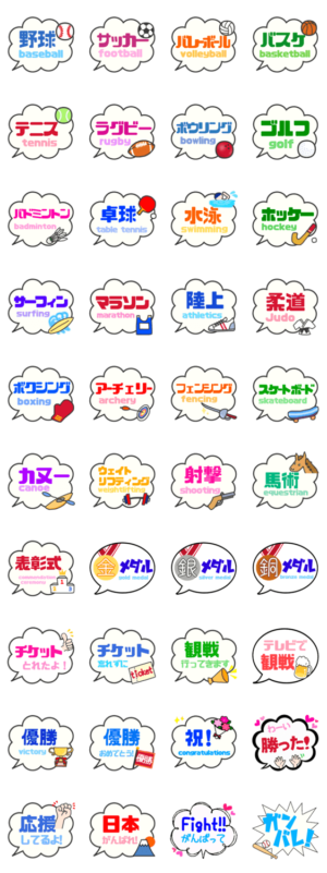 色々なスポーツの競技、種目、試合観戦、応援用スタンプ。 球技、陸上、水泳、柔道、野球、サッカー、ラグビー、卓球、サーフィン、バスケ、メダル、表彰、優勝sas-r より発売