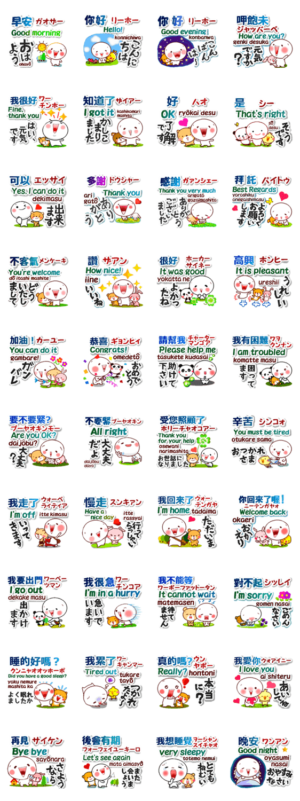 中国語(台湾)と日本語と英語 連絡用発音付 スタンプ画像一覧