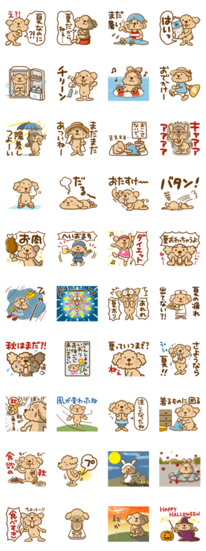 限りなく人間に近いリアクション犬、トイプードルのぷう太郎の夏から秋にかけて使える季節のスタンプです。