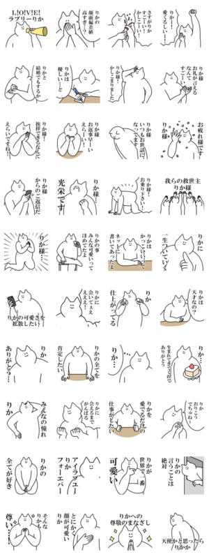 りかちゃんに送るスタンプ。ほめる、媚びる、煽る、煽り、推し。褒め言葉。彼氏/彼女/友達/大好き/オタク/ヲタク/アイドル。リカ 梨花 莉嘉 里香 理香 梨華 梨香/oroninetoroninet より発売