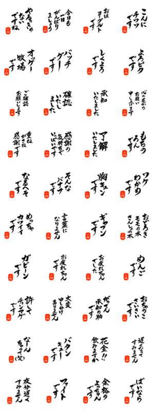 山根さん用死語入り筆文字のスタンプ。敬語丁寧語で仕事でもバンバン使える。判子(はんこ)付きで見た目も鮮やか!