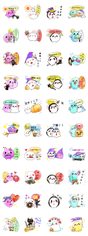 紅白餅がモデルのジョニー&ジェルニー、海苔のお餅たいやくん、笹餅のブルーが黒猫のアキとのハロウィンや、うさぎのルナとお月見など、秋をテーマにしたスタンプです。
