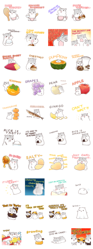 合わせハムハムシリーズの 英語版。止まらない食欲に、ハロウィンネタも入ってるかわいいハムスタースタンプです。