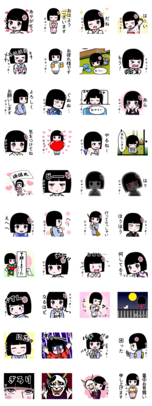 『ぢゅっきー』用のよく使う言葉を詰め合わせた座敷童子のスタンプです。和服 着物 浴衣かがりひな より発売