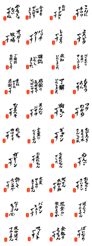 大音さん用死語入り筆文字のスタンプ。敬語丁寧語で仕事でもバンバン使える。判子(はんこ)付きで見た目も鮮やか!