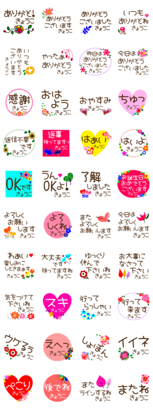 名前スタンプ、きょうこ、京子、恭子、杏子、今日子、香子、響子、キョウコ、丸文字、デカ文字、でかくて見やすい、挨拶、気持ち、返事、うさた広島