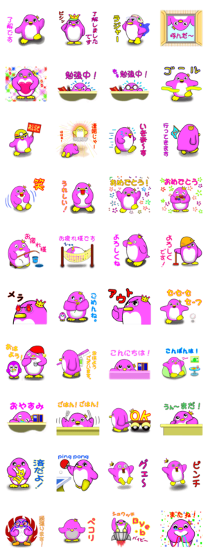 ピンクペンギンPの毎日使えるスタンプです。日常会話のほかに、お呼び・ピンチ・お知らせ・情報・勉強中・卓球などを含めました。