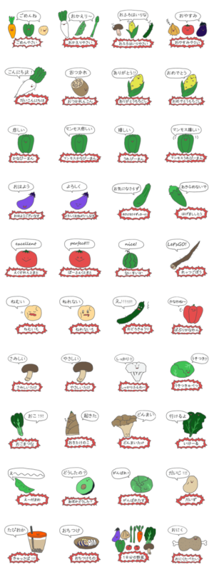ごめんやさいシリーズのスタンプです。お野菜って健康にとっても大事なんですよね。知ってましたか?つまりスタンプにも野菜は大事なんです!以上です。