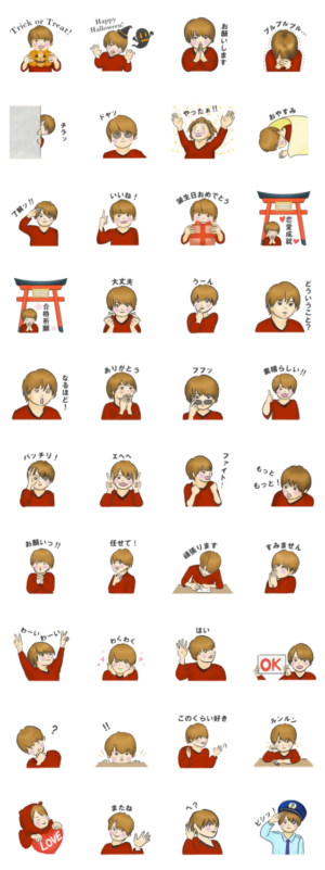 赤い男の子の毎日使えるスタンプです。日常会話に加えて、誕生日や秋のハロウィンスタンプ、恋愛成就と合格祈願の神社スタンプ付き。Cheer より発売