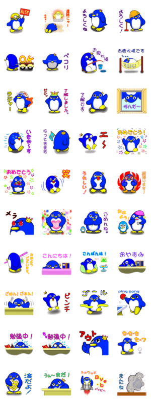ブルーペンギンBの毎日使えるスタンプです。日常会話のほかに、お呼び・ピンチ・お知らせ・情報・勉強中・卓球などを含めました。