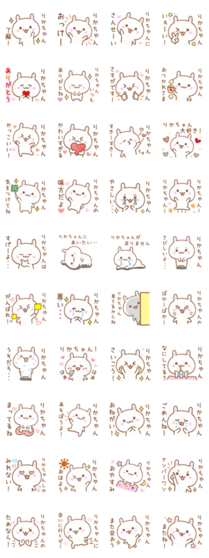大切な「りかちゃん」へ送れる、ウサギのあだ名・名前スタンプです。ほめる言葉も。りか/リカ/梨夏/里香/梨加/梨夏/梨花/りかこ/利加/利華/梨佳/rika