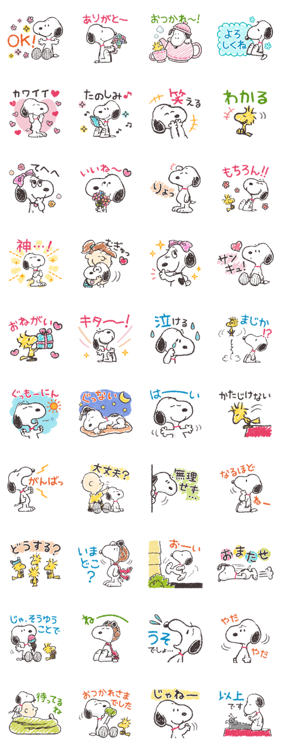 「ありがとー」「おつかれ」「よろしくね」など友だちとのトークでよく使うメッセージが、かわいい手書きのスヌーピーと一緒に使えるスタンプです