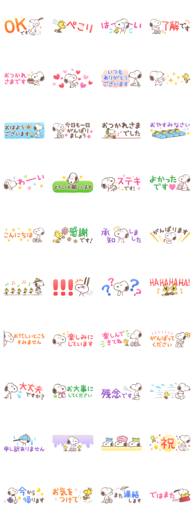 会話になじむスヌーピーの小さなスタンプです。敬語も入っていて、お友達はもちろん目上の方にも送りやすいスタンプとなっています。