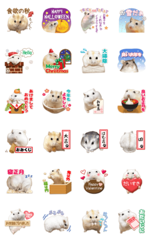 ハロウィン、クリスマス、年末年始、節分、バレンタインのイベント&日常に使える写真スタンプ。2020年(令和2年)子年(ねずみ年)のお正月はハムスターのスタンプで♪