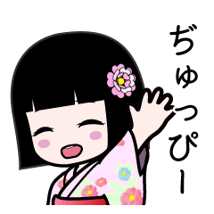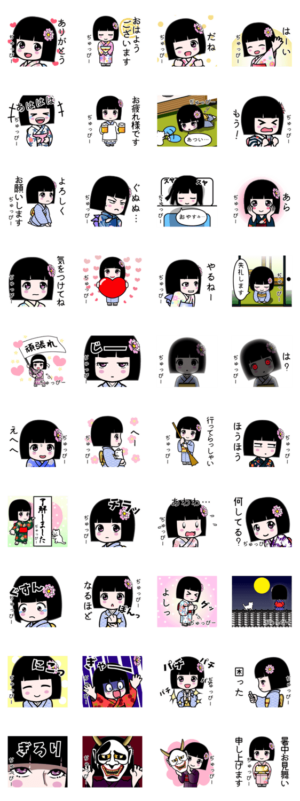 『ぢゅっぴー』用のよく使う言葉を詰め合わせた座敷童子のスタンプです。和服 着物 浴衣かがりひな より発売