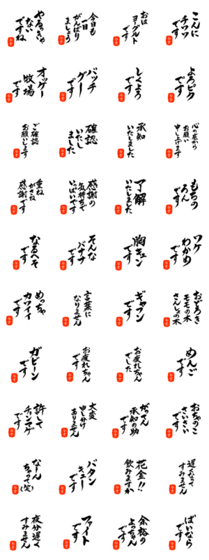 南雲さん用死語入り筆文字のスタンプ。敬語丁寧語で仕事でもバンバン使える。判子(はんこ)付きで見た目も鮮やか!