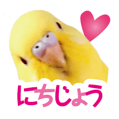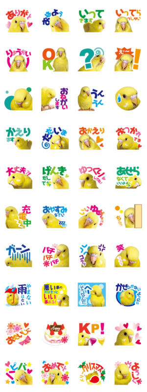 日常よくつかう言葉のスタンプ。黄色いセキセイインコ(レモンちゃん)の写真入りで、文字は大きめ、気使い言葉も多め。子供インコのかわいさでのあなたの毎日を癒します!