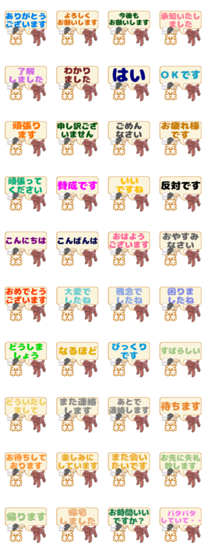大きな文字で読みやすいかわいい犬スタンプ。大人の日常会話。ありがとうございます。今後もお願いします。お疲れ様です。頑張ってください。承知しました。また連絡します