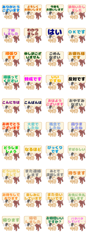 大きな文字で読みやすいかわいい犬スタンプ。大人の日常会話。ありがとうございます。今後もお願いします。お疲れ様です。頑張ってください。承知しました。また連絡します