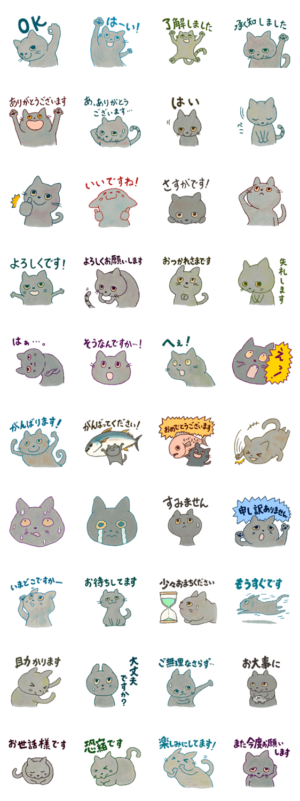 物腰柔らかいおとなの対応ができる、敬語のスタンプです。 猫の種類はブリティッシュブルー!オイルパステルという画材で楽しい風合いを出しました。ハネスケ より発売