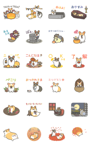 コーギーの動くスタンプ「秋」バージョンです。秋の日常やハロウィンなどのイベントで動くコギの成分が欲しくなったらお使い下さい。