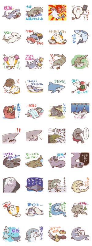 丸っこいサメとエイのスタンプ。ギンザメもいます。ホホジロザメとアカエイ多め。サメ吉 より発売