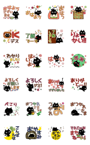 静止スタンプ「秋色・冬色デカ文字に黒猫」でよく使われる言葉を厳選、リメイクしたアニメーション。クロネコが可愛く動いてカラフルで大人かわいい【デコスケのスタンプ】