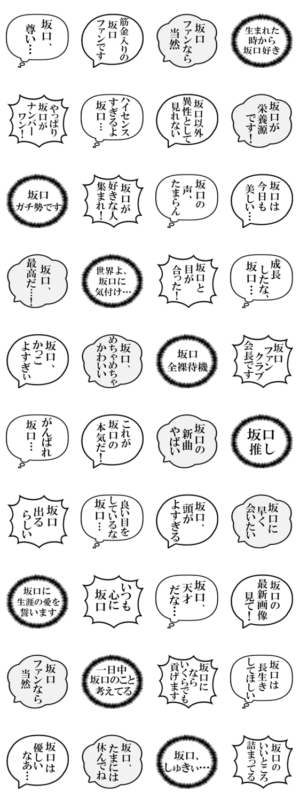 坂口(さかぐち,さがくち)さんを推しているあなたの、好きでたまらない気持ちを代弁するスタンプです。Toda より発売