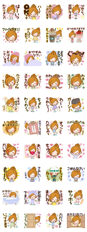 ふんわりやさしい女性らしいカラーと、よく使う言葉、ハッピーな言葉がいっぱいのスタンプです♪☆「ほのぼのカノジョ」ルルー作