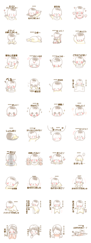 自分が主語になるカスタムスタンプは多く見かけますが、我が子が主語のスタンプは初めて見ました。実両親や義両親へ孫からのメッセージとして送ると喜ばれそうです。