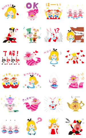 不思議の国のアリスのコミカルなスタンプです。可愛いですね!24種類ダウンロードできるのは良いですね!