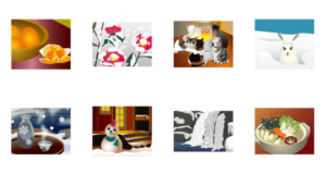 こたつミカン、雪ウサギ、雪見酒、ストーブネコ、雪だるま、凍る滝、寒椿、鍋Yuriko Oshima より発売