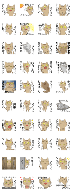 かわいいネコのお名前スタンプ。きくち、きく、きくかわ、きくえ、きくよ、、、全国の「きく」ちゃん専用です。茶トラ、しまねこ。