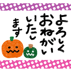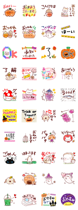 秋から冬へ。寒くなってくる季節に楽しく使えるスタンプです。ハロウィン・秋の味覚など、季節を感じる内容となっています。文字も大きく見やすく作りました。
