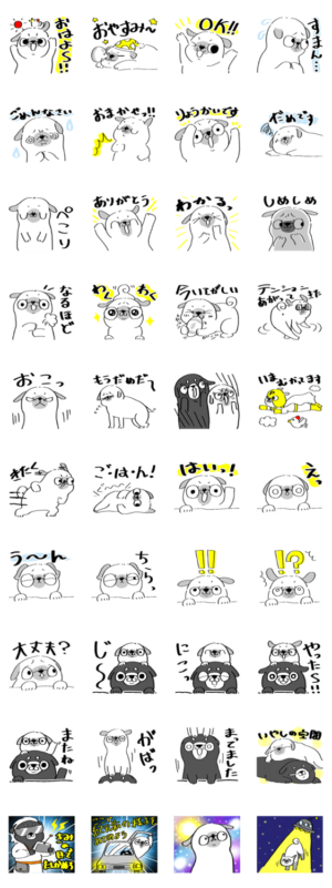 元気なひーちゃんとシニアの黒パグくーさん、二匹のパグが活躍するスタンプです。いぬむら より発売