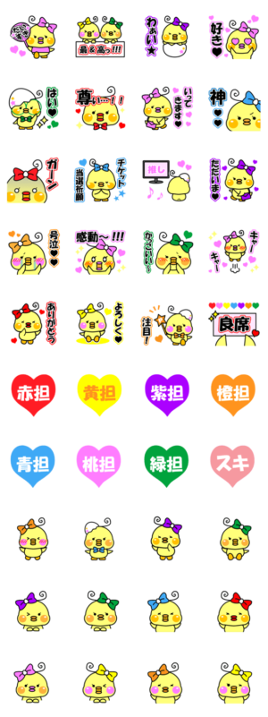 日々推し事に萌えるひよこちゃん。赤青黄橙緑紫桃担当のジャニヲタ・ドルヲタに使って欲しい♥後半は写真に貼るのに使いやすいふちなし文字なしです!友達に自慢しよう!!りうぽん より発売