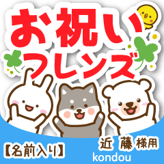 近藤/こんどう様専用★お祝い動物フレンズ名前入り!ねこ,犬,白兎,熊猫等のイベント挨拶!誕生日おめでとう,新年,クリスマス,ハロウィーン,出産,結婚,就職,合格,入学,卒業他お名前入りスタンプ専用★アイシスデザイン株式会社 より発売