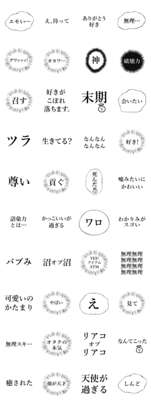 おたくに便利な吹き出しスタンプ♡ 他のスタンプや写真と一緒に使ってみよう♡ 推し/アイドル/オタ/ヲタ/ふきだし/KPOP/ジャニーズ/アニメ/声優/俳優/韓国/が好きな方に♡ぽみー より発売