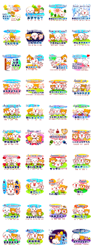 日本語(ひらがな表記でローマ字発音付)と英語で人にやさしくなれる言葉を集めたスタンプです。世界の人たちとぐっと仲良くなれますよ。